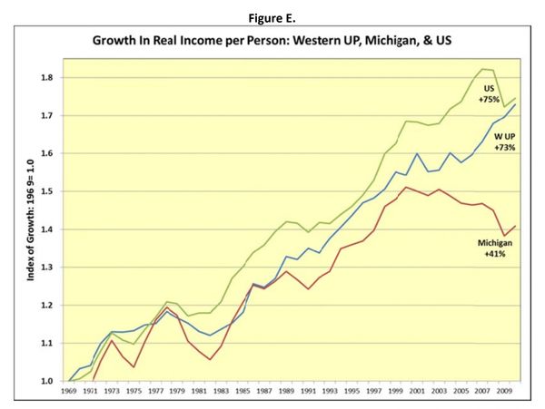 "Between 1969 and 2010 the increase in real per capita income in the Western U.P. was 73%, nearly on par with the national average of 75%, and far higher than the growth of Michigan as a whole, which was only 41%.