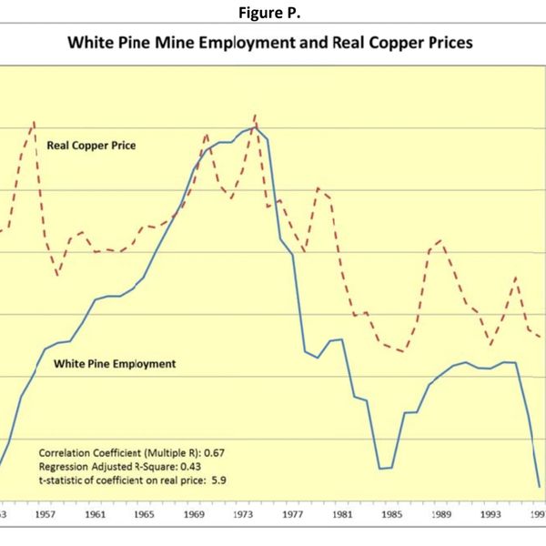 "Western U.P. jobs declined by 4,000, or 55%, between 1969 and 2010 in the fields of mining, forest products, manufacturing, and agriculture, mostly associated with the closure of the White Pine Mine.